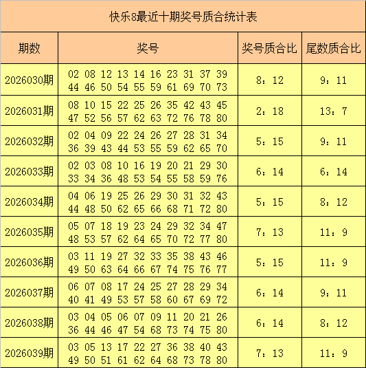 福彩快乐8第2026039期开出奖号:03 05 13 17 22 27 36 38 40 43 49 50 51 61 62 64 68 73 78 80,其中奖号质合比为7:13,奖号尾数质合比为11:9。